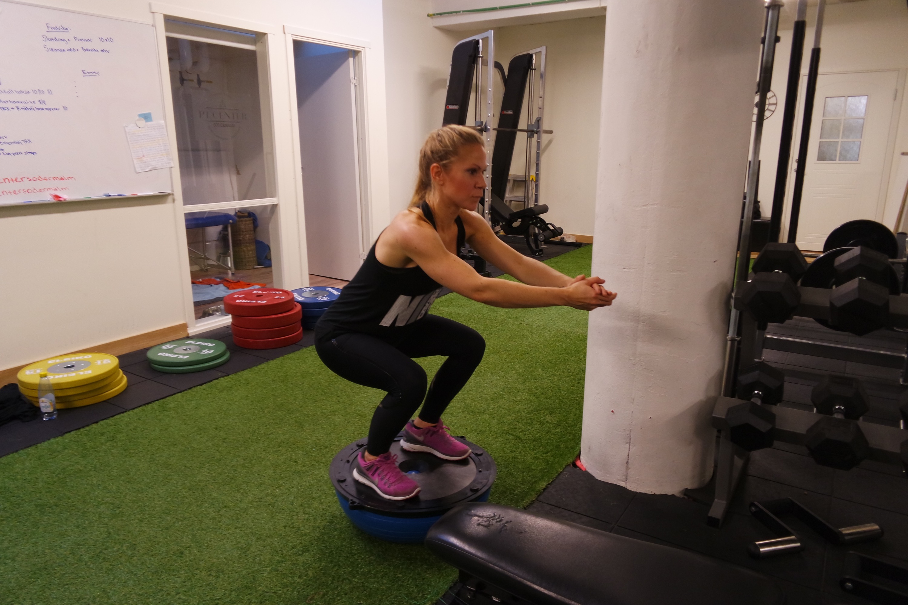Efter lunch så var Jenny först ut. Här vill vi lägga mkt fokus baksida ben då det är den del på benen som vi såg på hållnings och rörelseanalyser måste komma ikapp. Jag lade även in lite stabilitetsövningar för knäna då hon haft mkt knäproblem. Tillsammans med rätt näring, behandling och träning ska vi nog få ordning på det med 🙂