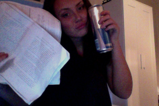 HAhahahah jag vet, bilden är jättemooogen, putar med läpparna, håller upp mina läxor och en giigantisk redbull.