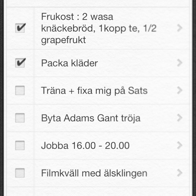 Godmorgon! Är påväg till tåget nu för att åka till gymmet, är lite stressad för jag ska åka och byta Adams tröja, sen måste jag hinna duscha och fixa mig för att sen åka till jobbet. Men det är roligt att ha lite saker att göra istället för att ligga hemma och sega bara. Aa det va väl det. Skriver mer lite senare ikväll. Det här är i alla fall mina planer:
