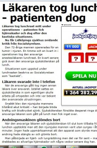 blir ju mörkräd när jag läser en artikel på aftonblade t o matt en 72 åring blivit opererad för sin tumör, och kirurgen tog lunch mitt uppe i oprerationen och patienten dog, då säge rjag hur fan tänker man när man tänker på att äta i första hand en rädda liv, fy fan säger jag rent ut sagt, blir så frusterard och arg när jag ser sånt här.. liksom man skall kunna lita på vården liksom , blir förbnnad asså . kolla här … http://www.aftonbladet.se/nyheter/article15394487.ab