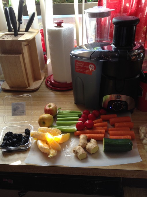 T.e.x. har gor jag en mixed drink med morotter, ingefara, apelsin, gurka, blackberries, celleri, rodbetor och apple.