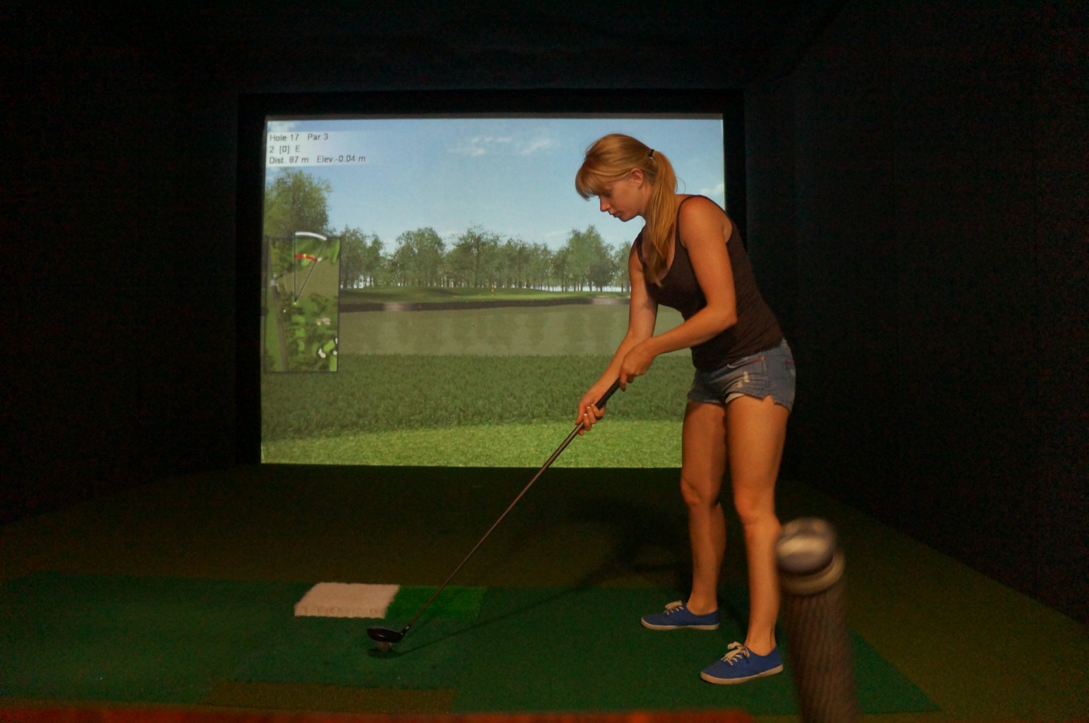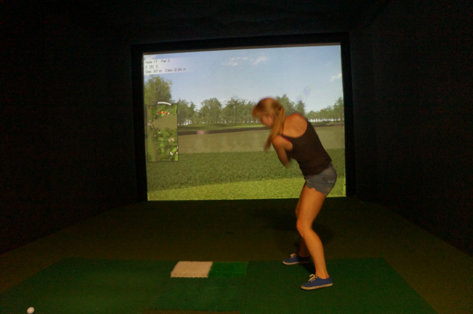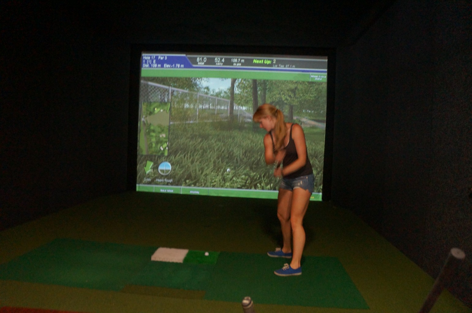 …må det være golf. Hvertfall simulatorgolf. Når vi var i Praha i sommer hadde de dette på hotellet. Jeg har aldri spilt noe annet enn minigolf så jeg kan ikke skryte på meg noen erfaring, og godt er det for dette var jeg veldig dårlig til.