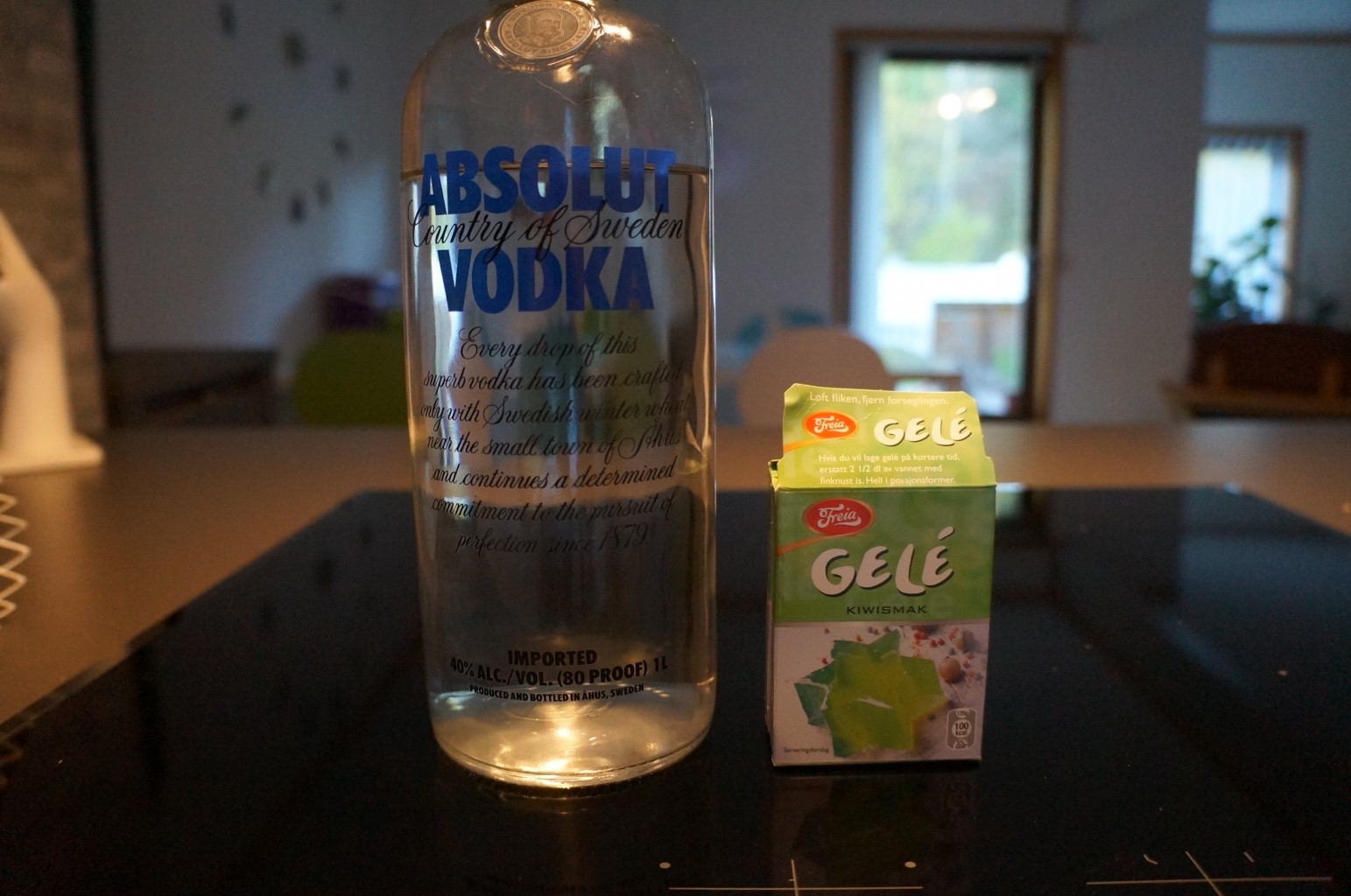 I vanlig gele trenger man kun vann, så tar man bare 2 dl vann og koker opp, har i gele’en og rører rundt. La det kjøle seg ned, pass på å røre innimellom. Når den er avkjølt har du i 2 dl vodka.
