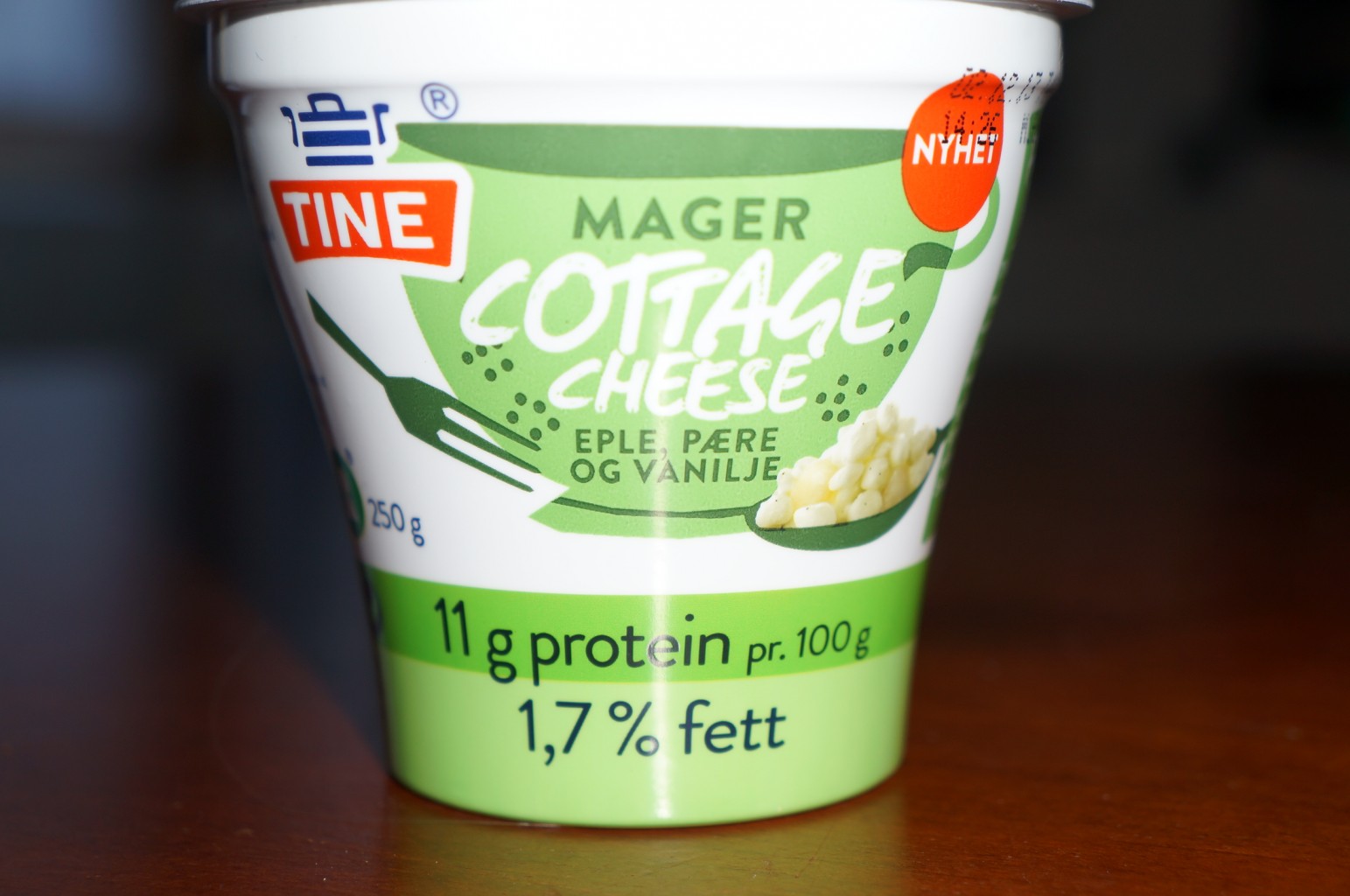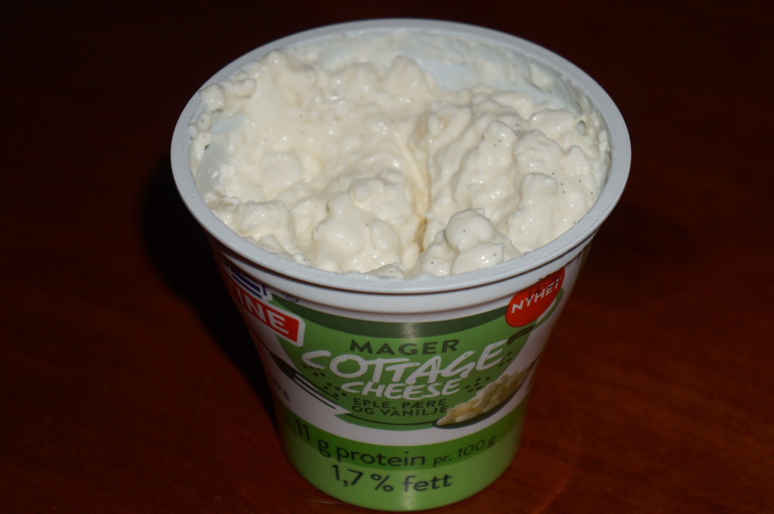 Jeg har rukket å være på jobb i 5 timer og kom hjem for 10 min siden. Nå sitter jeg å spiser en ny type Cottage Cheese som har kommet ut, vel av alt jeg vet så er det bare en butikk som har den enda, de spesialbestiller varer som mange andre butikker ikke tar inn. Dette er en av disse. Det er vanlig Cottage Cheese med eple, pære og vanilje. Den er litt sær, men smaker greit når man får så mye smak på det. Er ikke den som spiser vanlig Cheeese fra boksen.