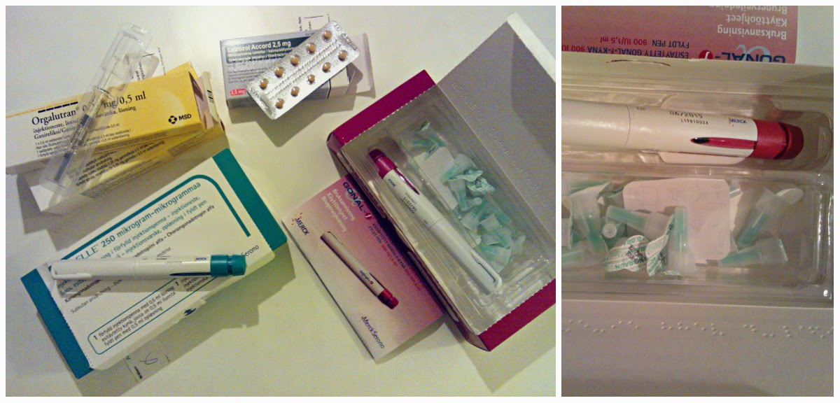 Här är en bild som visar allt roligt jag får handskas med varje dag under denna process. Ser inte direkt fram emot det igen men man vänjer sig snabbt. Jag kallar dom för bebispruta, dom är så små man känner knappt den nålen man ska ta dagligen. Dom sista dagarna ska man ta en annan tjockare spruta den känns lite mer men ingenting för en tuffing! Det blir ingen magträning under denna period då magen svullnar upp som en ballong.