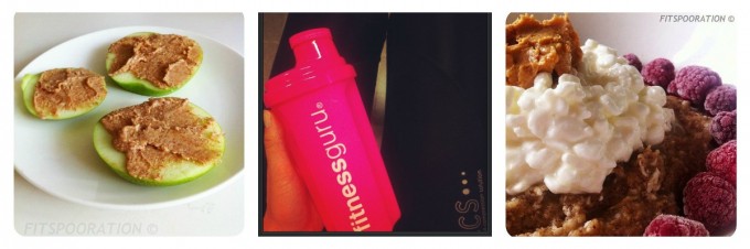 Min standard måltid innan träningen är oftast en skål med havregrynsgröt (kolhydrater) toppat med keso och/eller kvarg (protein) och jordnötssmör (fett). Det är en perfect kompination! Om jag inte är hemma och går direkt til gymmet från skolan brukar jag ha med mig en frukt som ett äpple eller kanske lite riskakor.