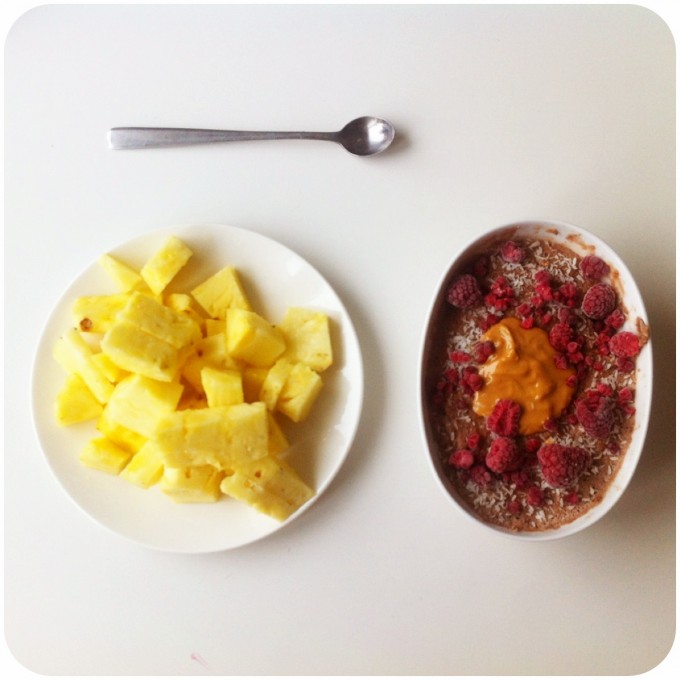 Söndags frukost: Protein gröt toppat med kokos, hallon och jordnötssmör. Delade tallriken med ananas med min mamma/ Sunday breakfast: Protein oatmeal topped with grated coconut, raspberries and PB. I shared the plate with pinaple with my mom.