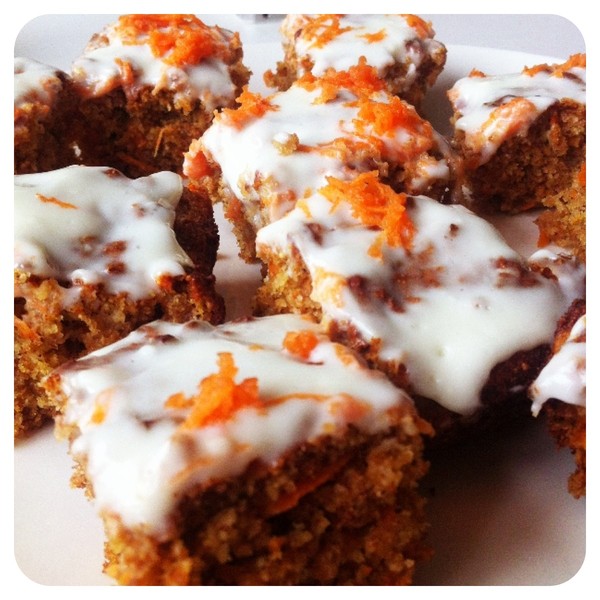Spread the frosting over the carrot cake when it has cooled down. Cut the cake into 24 squares.