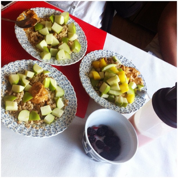 Quinoa oatmeal, peanutbutter, apples, protein shakes, mango.