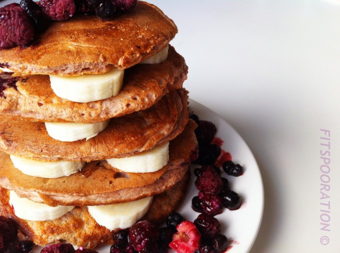 These pancakes did I make for breakfast today and interspersed them with banana, raspberry and blueberries. Absolutely amazing, try these!