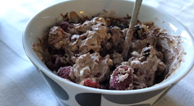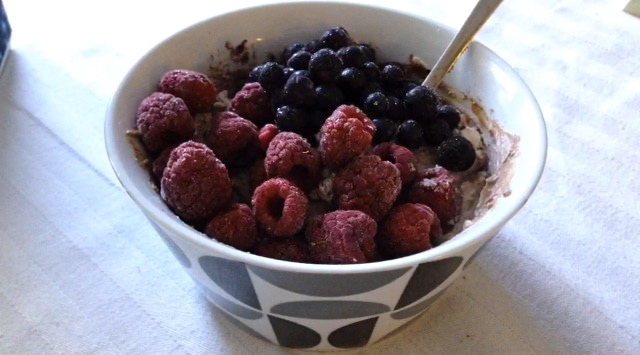 Something that I eat almost every breakfast and often as a snack is a mixture of cottage cheese, quark, cocoa powder, stevia and berries. It’s really super tasty! I usually don’t show it in my pictures because it looks mostly just messy and mashy, but now I thought I would share this wonderful creation to you!