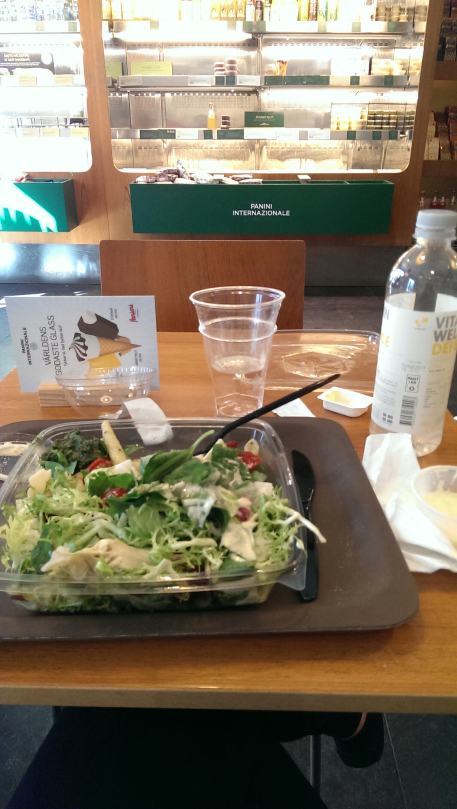 Sitter och äter min lunch på panini Internazionale. Som tydligen ska ha vunnit pris ”årets hälsokoncept” vilket är bra!