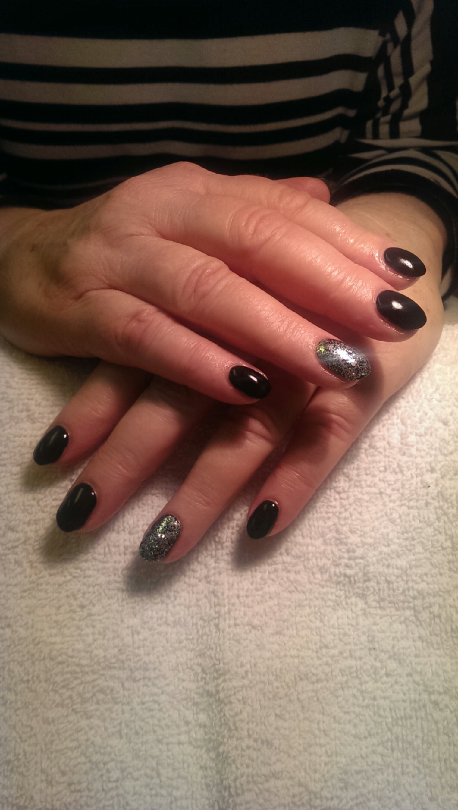 En av dagens tre naglar! 8 december 2013 av fridajonsson Svarta med silverglitter på ringfingret. Passar till både jul och nyår!