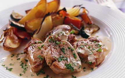 Pepparbiff med potatis och rutfrukter i ugn och pepparsås