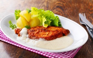 Blanda vetemjöl med salt och peppar. Vispa upp ägget. Vänd köttet i mjölblandning, ägg och sist ströbröd.