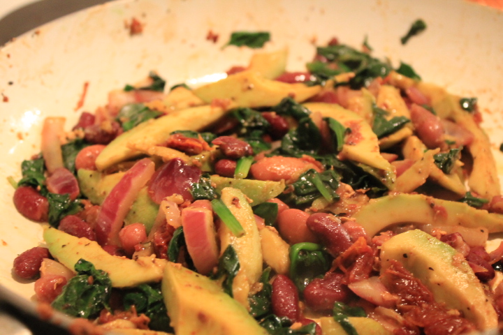 - Lägg avokadon, bönblandningen, spenaten, rödlöken, resten av de soltorkade tomaterna i stekpannan och stek till de. Häll lite citronsaft på.