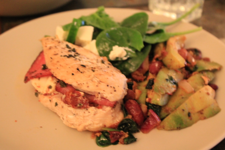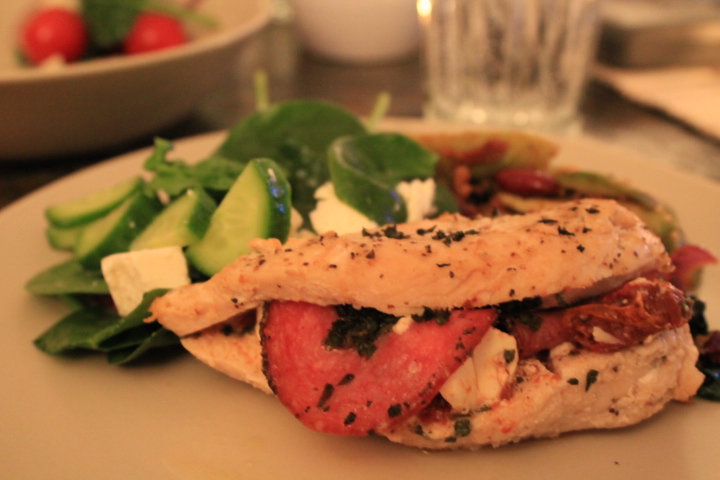 - Skär ett snitt i kycklingen och lägg i Salami, fetaost, soltorkade tomater ( i bitar) och basilikan. Lägg dem i en ugnsfast form.