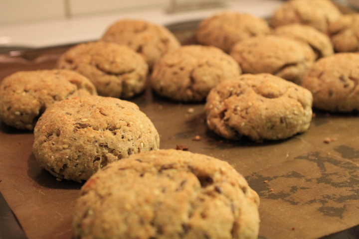 - Forma små bullar (15-20 st) platta till och lägg på en bakplåtspapprad plåt.