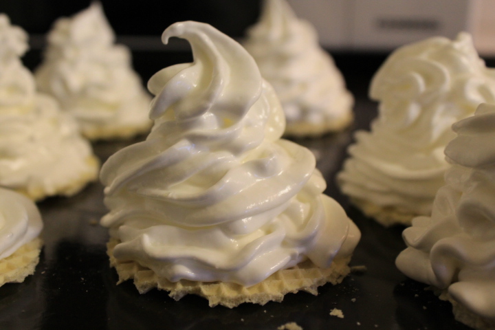 3. Vispa äggvitorna till hårt skum, tillsätt socker och vaniljsocker lite i taget.