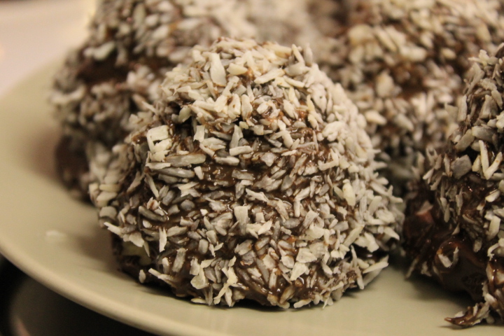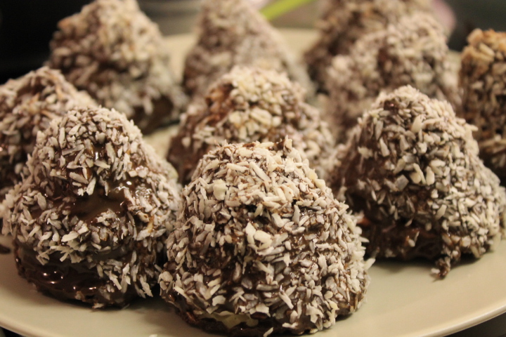 8. Häll upp kokosen i en skål och nu är de bara att toppa rånet med marängsmeten i chokladen, och sedan över i kokosen.