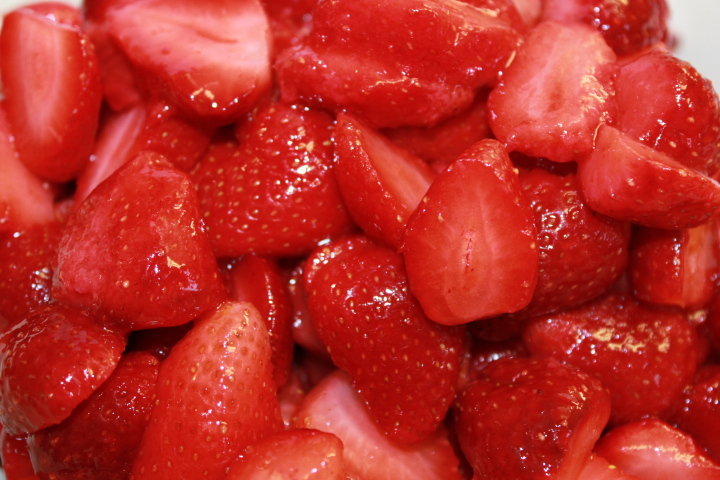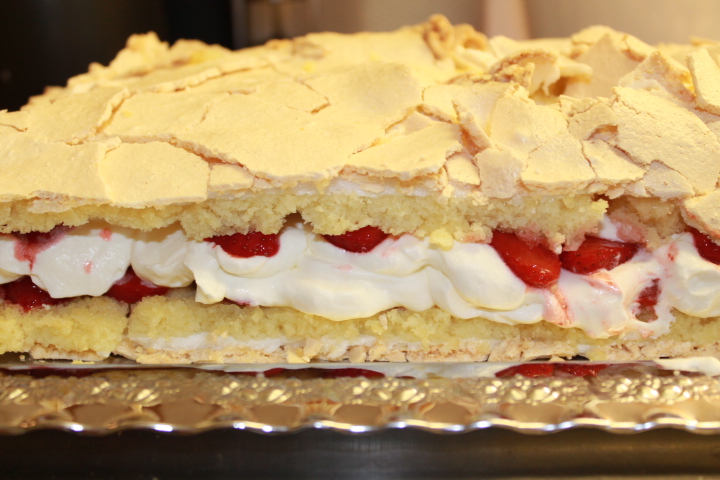 - Jag skar jordgubbar sedan och lade på tårtan och sedan ett lager grädde och sedan lite skivade jordgubbar igen.