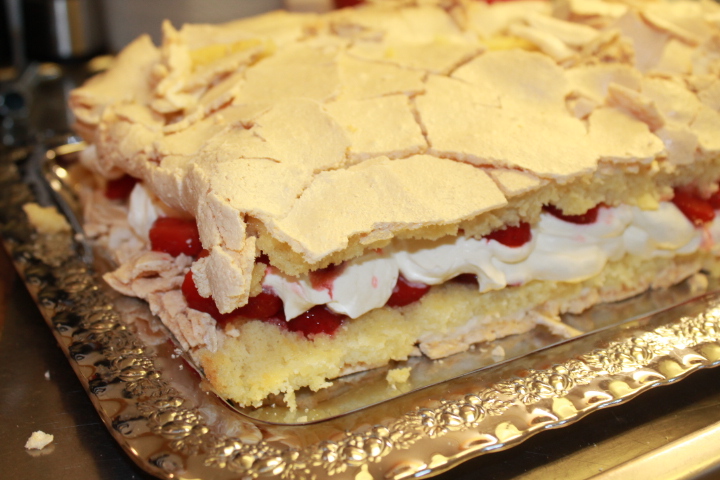 - När tårtan har svalnat, dela då tårtan på mitten och ta och vänd på tårtan så att marängen hamnar ner på en bricka.