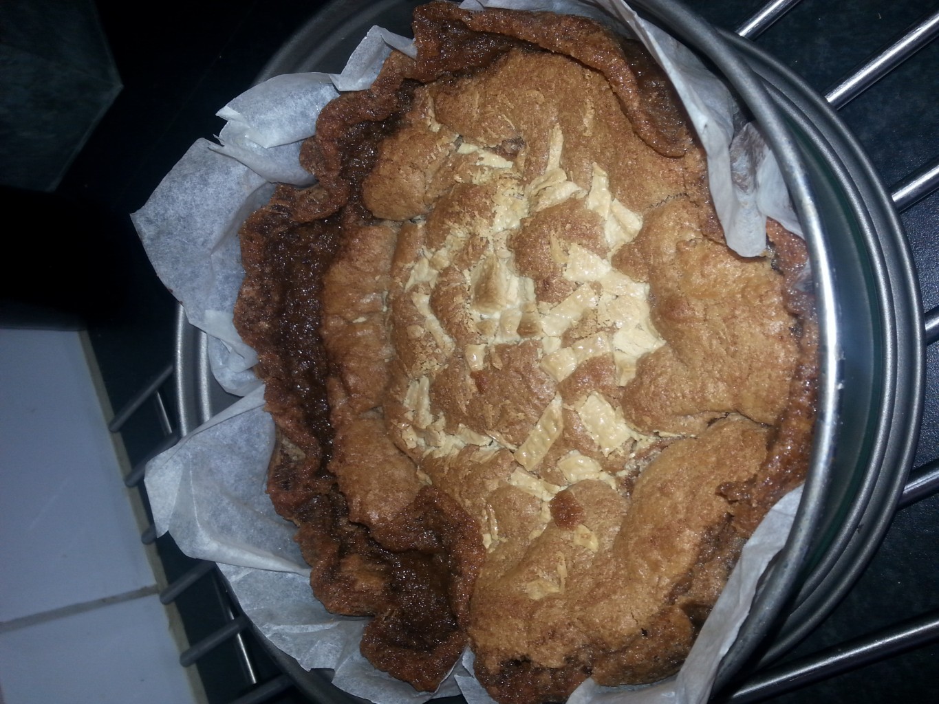 10. Ta ut och låt svalna i 10 min. Vänd därefter kakan till ett galler med bakplåtspapper på och låt svalna där i 30 min.