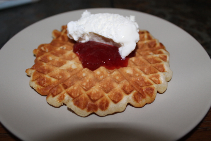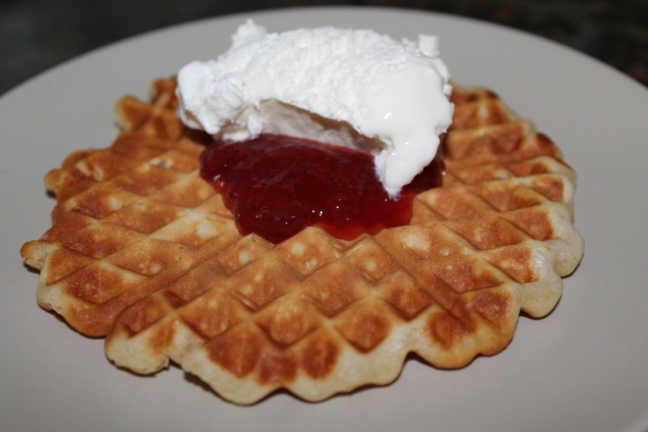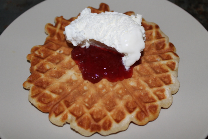 3. Vispa äggvitorna hårt och vänd ner i smeten. Grädda våfflorna i ett våffeljärn och smöra laggen emellanåt.