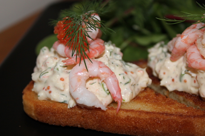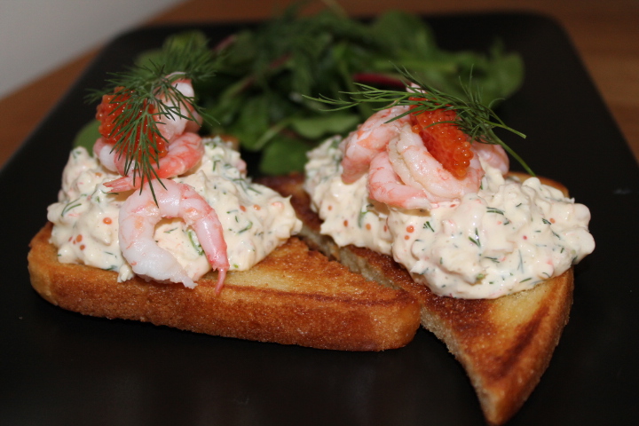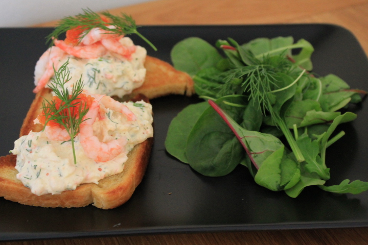 6. Servera genom att lägga en klick av räkröran på toasten och dekorera med räkorna som blev kvar och även en klick löjrom samt dillkvist