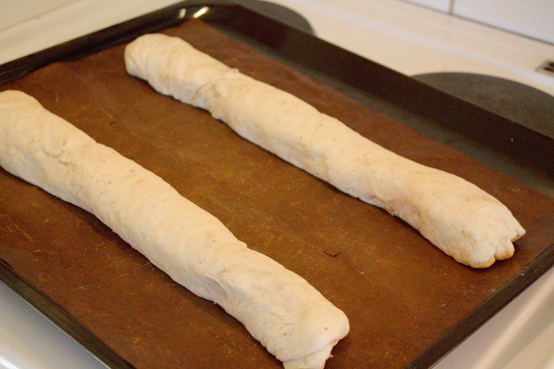 - Dela rullarna i 2 längder och lägg dem med skarven ner på en plåt med bakplåtspapper. Klipp längden i flikar och lägg dem växelvis åt höger och vänster.