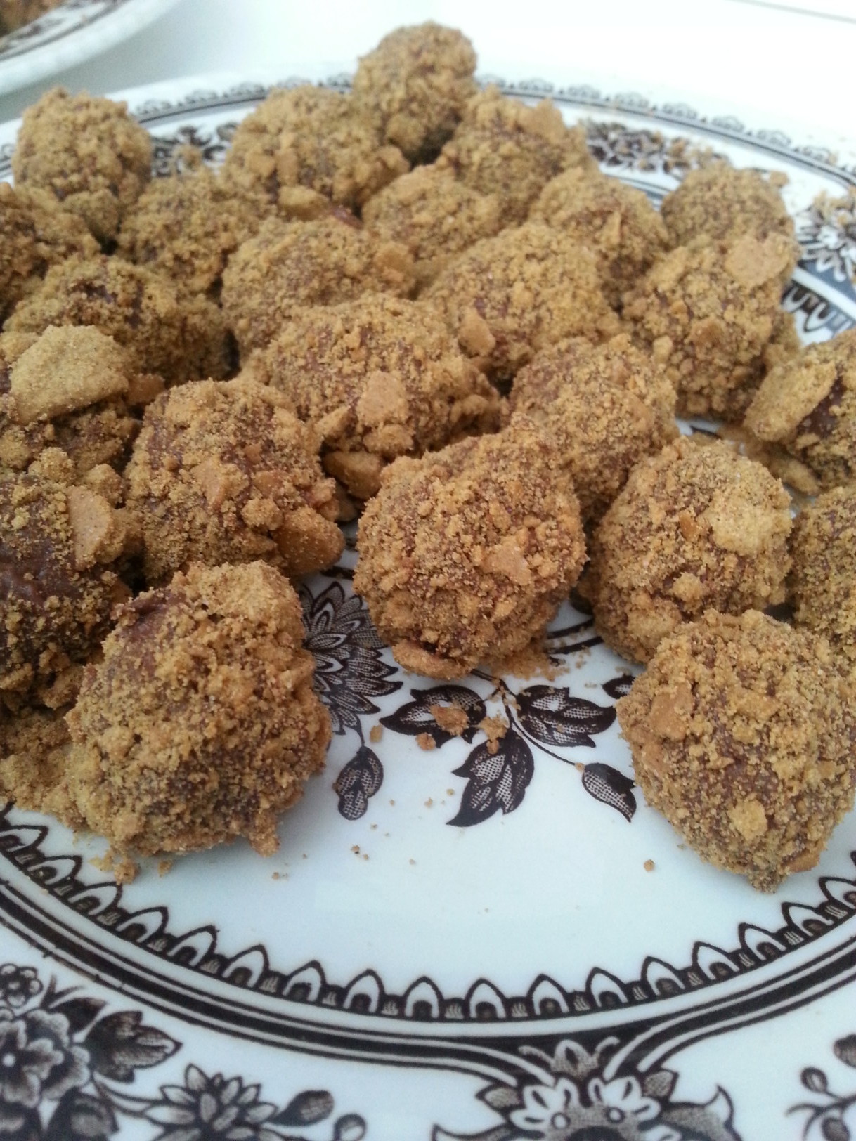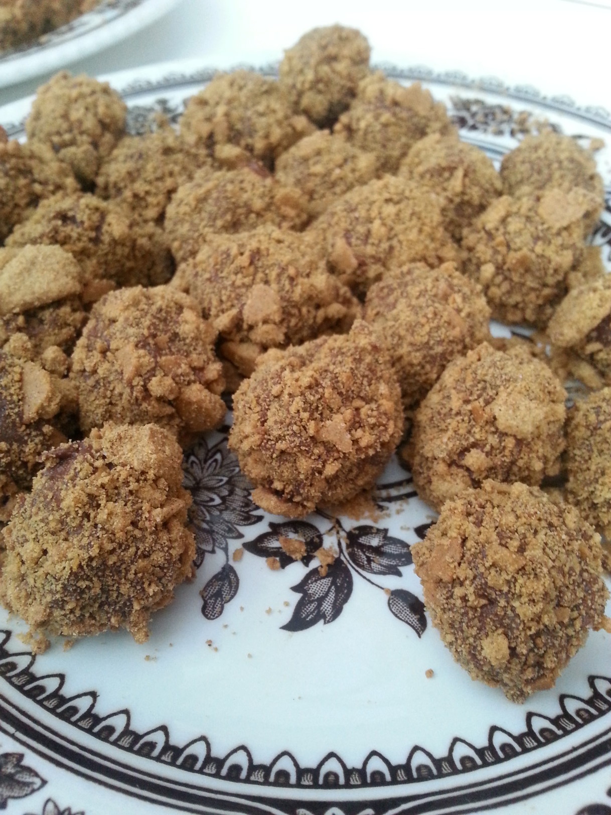 - Rulla bollarna först i chokladen och rulla sedan i pepparkakorna.