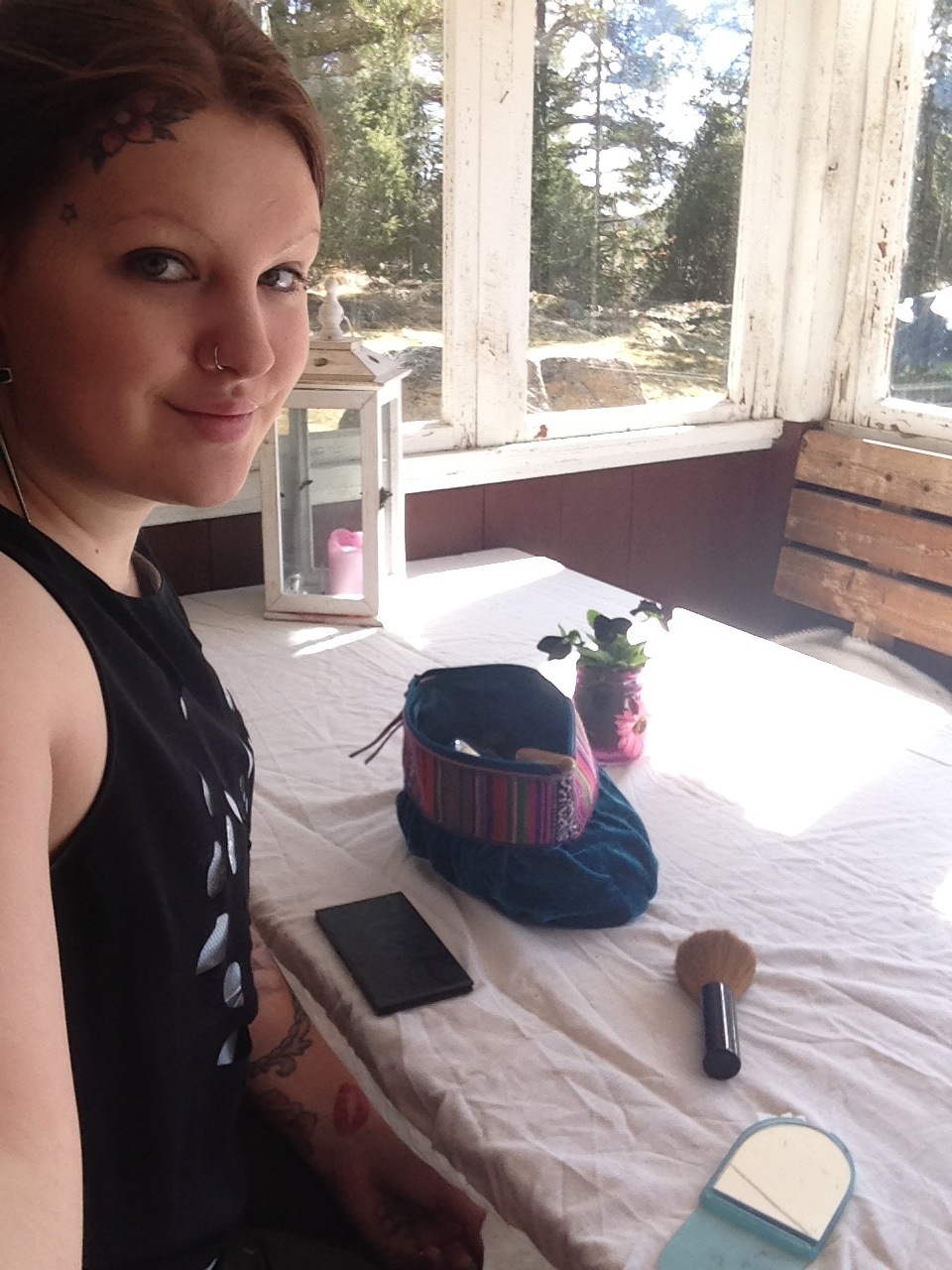 Trött… 27 apr 2013 av glarke Nu har jag fixat det sista samt klätt mig :p nu sitter jag på altanen och sminkar mig 🙂 vart svarta kläder så tänkte köra med lite risa smink 😉 Glarke