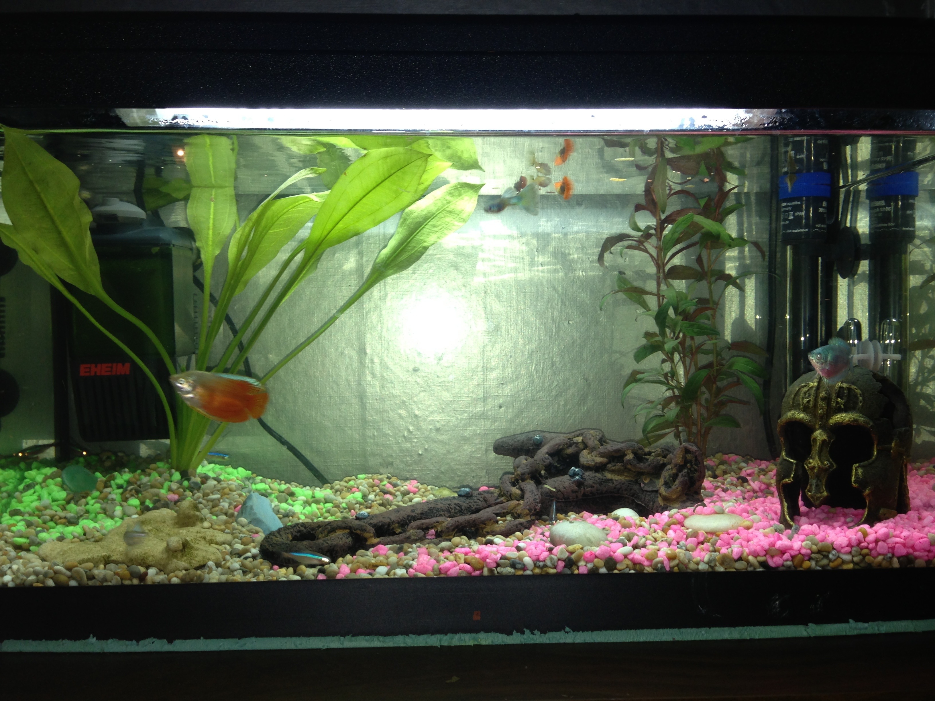 Jag kom hem till en mörkt hus med alla katter ute ^^, dom kom skrikandes och jamandes och ville ha mjukmat! Kom in, gav dom mat sen tände jag akvariumet……. OJ SÄGER JAG BARA!!!!! Så jävla vackert! Helt otroligt fint och jag är så glad att jag äntligen kom till skott och fixade ett eget! Så klart känns det lite surt att det vart dubbelt liksom men vad ska man göra? "/ istället för ett helt nytt start kitt för 595kr så köpte jag först allt för 400, sen fick vi ju åka och komplettera grejer å det vart typ 700kr sen idag fick jag köpa helt nytt för nästan 600kr så då vart det 1700… Det känns sådär men aja… "/