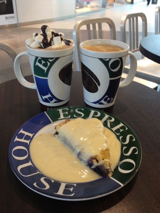 När vi kom till gallerian så började vi inne på Vera mode där vart det en tröja och några trosor. Efter det prata vi med farmor om att luncha tillsammans men hon skulle inte bli klar förren efter tolv (då va klockan vara strax efter 10) då gick vi till en fik som heter espresso house. Där köpte vi en latte, varm choklad och en blåbärspaj som vi snaskade på och vi vart väldigt nöjda. Kaffet var väldigt likt starbucks på smaken. Det var en av dom godaste lattarna jag någonsin smakat!