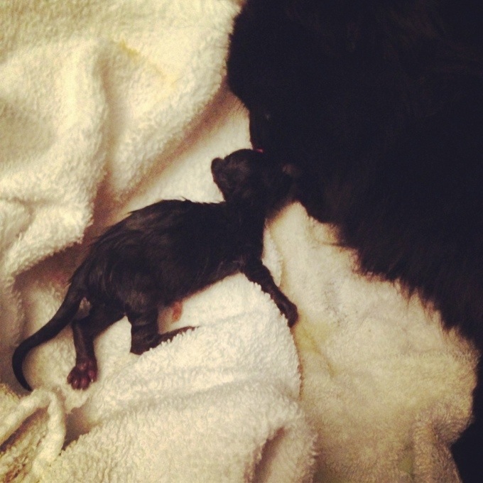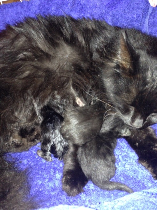 Jag vart lite rädd tidigare för efter tre timmar så ringde jag till veterinären som sa att det kunde ta upp till 12 timmar mellan bebisarna. Den tredje tog ca 5 timmar men som sagt, NU ÄR DEN ÄNTLIGEN UTE!
