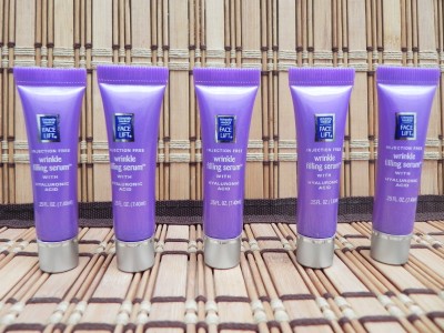 The wrinkle filling serum fills wrinkles in with hyaluronic acid, a natural filler found in our own bodies.
