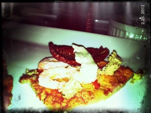 Vad gott det är med olivolja, flingsalt, räkor, soltorkade tomater, kronärtspesto och mozzarella. Bra att man kan ha allt det på en och samma pizza då! Sketbra.