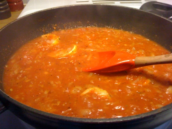 Det är just därför köket doftar så gott. En tomatsoppa med gul lök och massa goa kryddor som chili, vitlök, franska örter och citron. Nu ska det få puttra en sväng sen ska jag hälla i sojabönor och ett paket bönmix och betyder som det låter – en mix av lika bönor. Man skulle, egentligen, kunna ha i vad som helst : köttfärs, frikadeller, rotfrukter, skaldjur eller bara som den är. Med en klick keso på toppen.