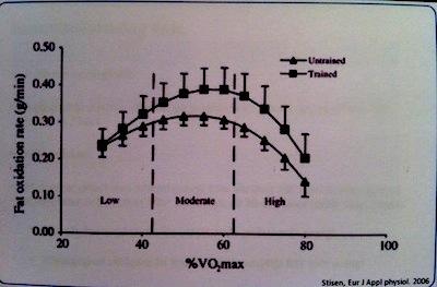 När du är vältränad kan du i mer ansträngande arbete använda andelen fett i större utsträckning. Som bilden nedan visar. Fyrkantslinjen är en tränad människas andel fett i förhållande till puls och trekantslinjen är en otränads. Det finns många fördelar med det. Men en fördel, man kanske inte tänker på sådär direkt det är ju att du kan träna kortare, tuffare pass, som bränner mer energi, men då också från större andel fett. För de som vill bränna fett är det bra. Korta effektiva pass. Det gillar jag.