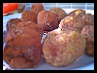 Kör allt i en mixer, antingen ihop eller var för sig och sen blanda. Smaksätt med 0,6 tsk kanel, 0,6 tsk kardemumma och 2 tsk kakao. Rulla till bollar.