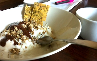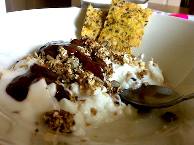 Majs- och frökex. Yoghurt,keso och nygjord müsli med banan och chokladklet. Och ja, det är en kaffekopp ni ser till höger…