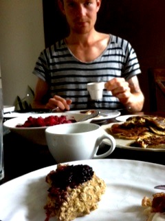 Bananmuffins med proteinpulver, hallon och vaniljkesella, kaffe, scones med gojibär och björnbär.