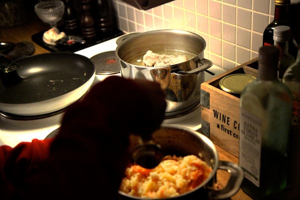 1kg fläsklägg sjuder i ungefär två timmar tillsammans med en gul lök, en morot, lagerblad och vitpeppar. Koka potatis, kålrot och morötter och mosa det. Häll i lite av spadet från läggen i moset istället för grädde eller mjöl. Krydda. Njut.