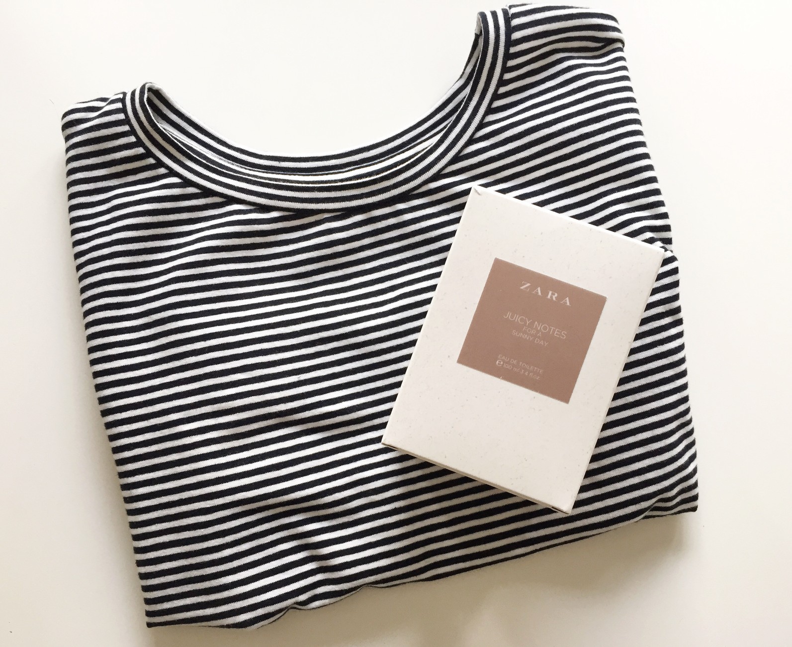 Bikinijakten gick åt skogen kan man säga. Mestadels för att jag har svårt att hitta underdelar som passar mig. Men ska kika igenom diverse internetshops också innan jag ger upp, sommaren och badsäsongen är ju här snart och då är det ju dumt att inte ha något att bada i. Men jag fick iallafall med mig en randig magtröja och parfym från ZARA. Parfymen heter ” Juicy Notes for a Sunny Day” och luktar såååå gott. Dags att börja fixa inför ikväll då det blir grillning på balkongen. Håller alla tummar och tår för uppehåll!