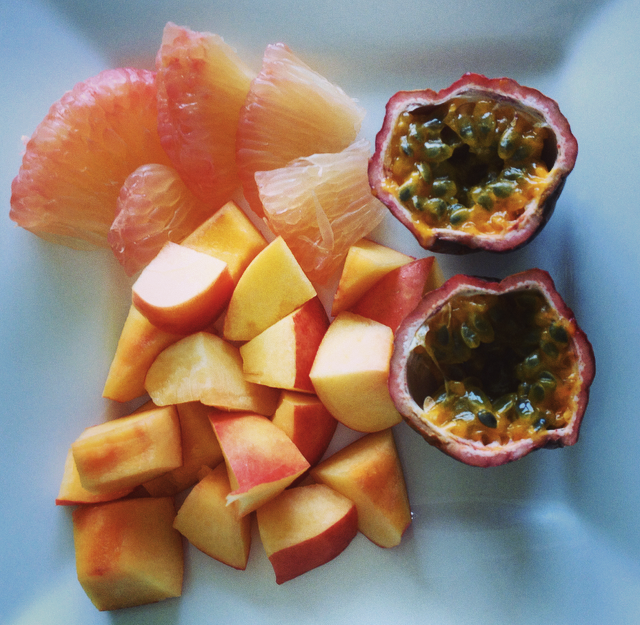 healthy peachy breakfast 5 August 20154 October 2014 by emmaanemone My breakfasts usually consist of this freshly cut fruits. Here I had nectarine, passionfruit and pomelo. I definitely get my five a day out here in Bangkok.