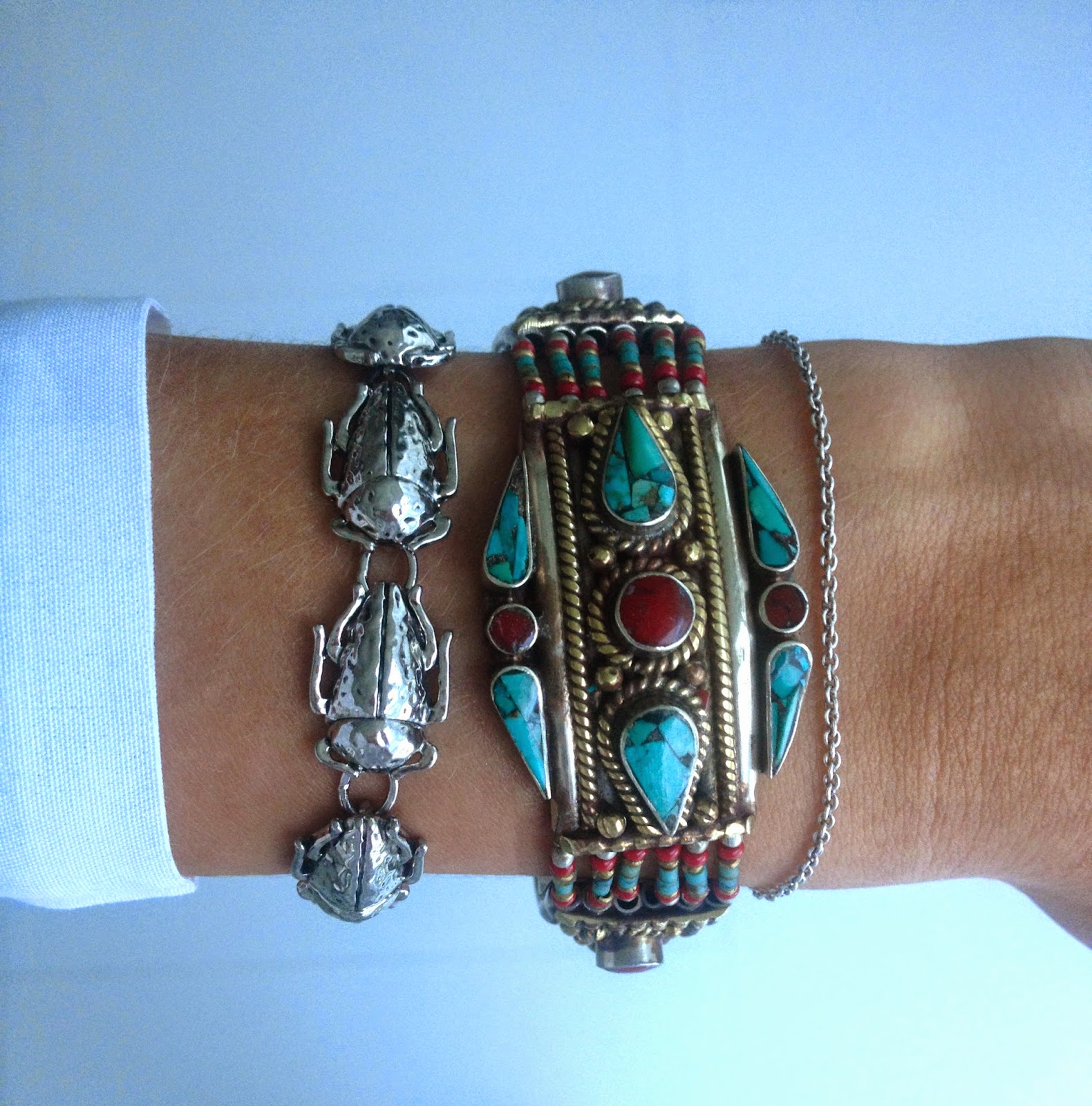 A jewellery detail. Bimba & Lola bug bracelet, a Nepalese bracelet and the thin silver link is from Carré Copenhagen. The bug bracelet and silver link are favourites that I wear all the time. The Nepalese and very colourful jewellery that I have, is almost always worn with white, black or gray simple outfits.