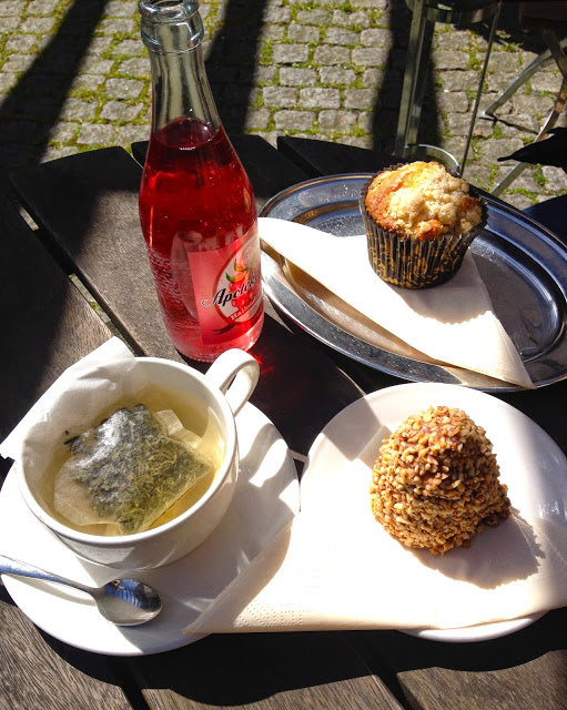 Today my boyfriend and I went to Malmoe to fix some practical stuff. Afterwards we had Kusmi tea, raspberry soda, a muffin and a Swedish cake called “gräddbulle” at “Lilla Kafferosteriet”. It was very cozy. The backyard was open so we could sit in the sun and enjoy our tea time.