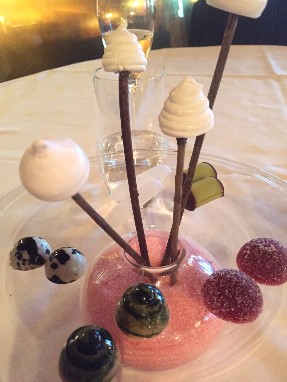 Here we go… The second part of our dinner at Operakällaren a while ago. My Dad had lamb (people always tell me that if I don’t like lamb, it’s because I never tasted “good lamb” but now I’ve tried Operakällarens and I’m still not fond of it). We also had a lemon meringue and berry sorbet as an in between course. Then my Dad had Valrhona chocolate as a dessert and I had a rhubarb and lemon dessert. When we payed the check, we got this plate with all kinds of small candies. My favourites were the marshmallows that we barbecued at the table, some chocolate/liquorice candies and the sugarcoated vodka (they are behind the sticks – almost invisible)!