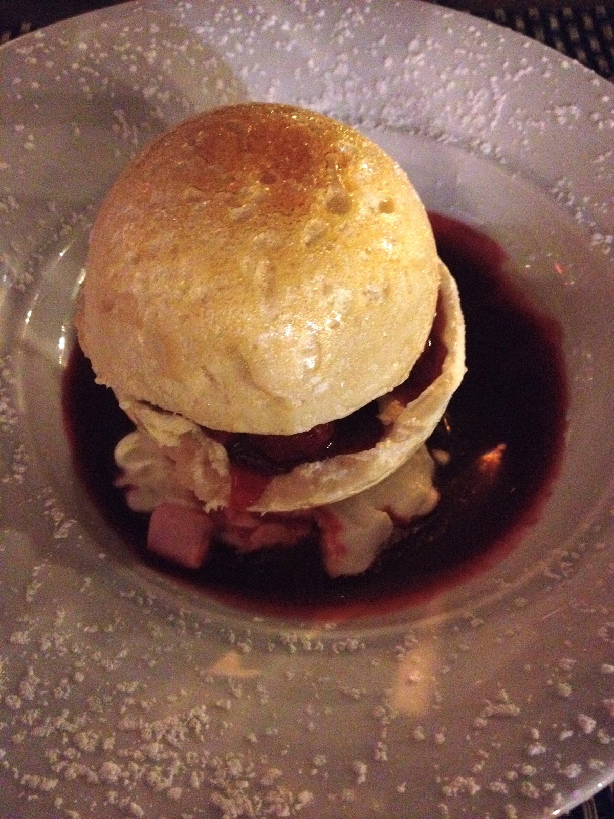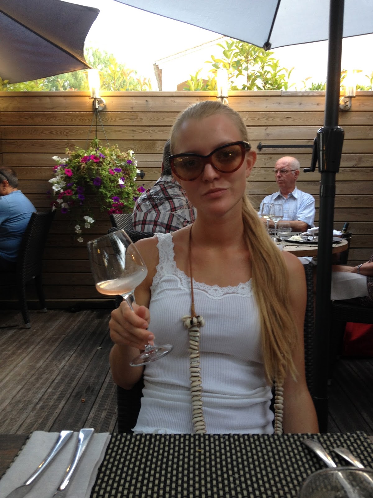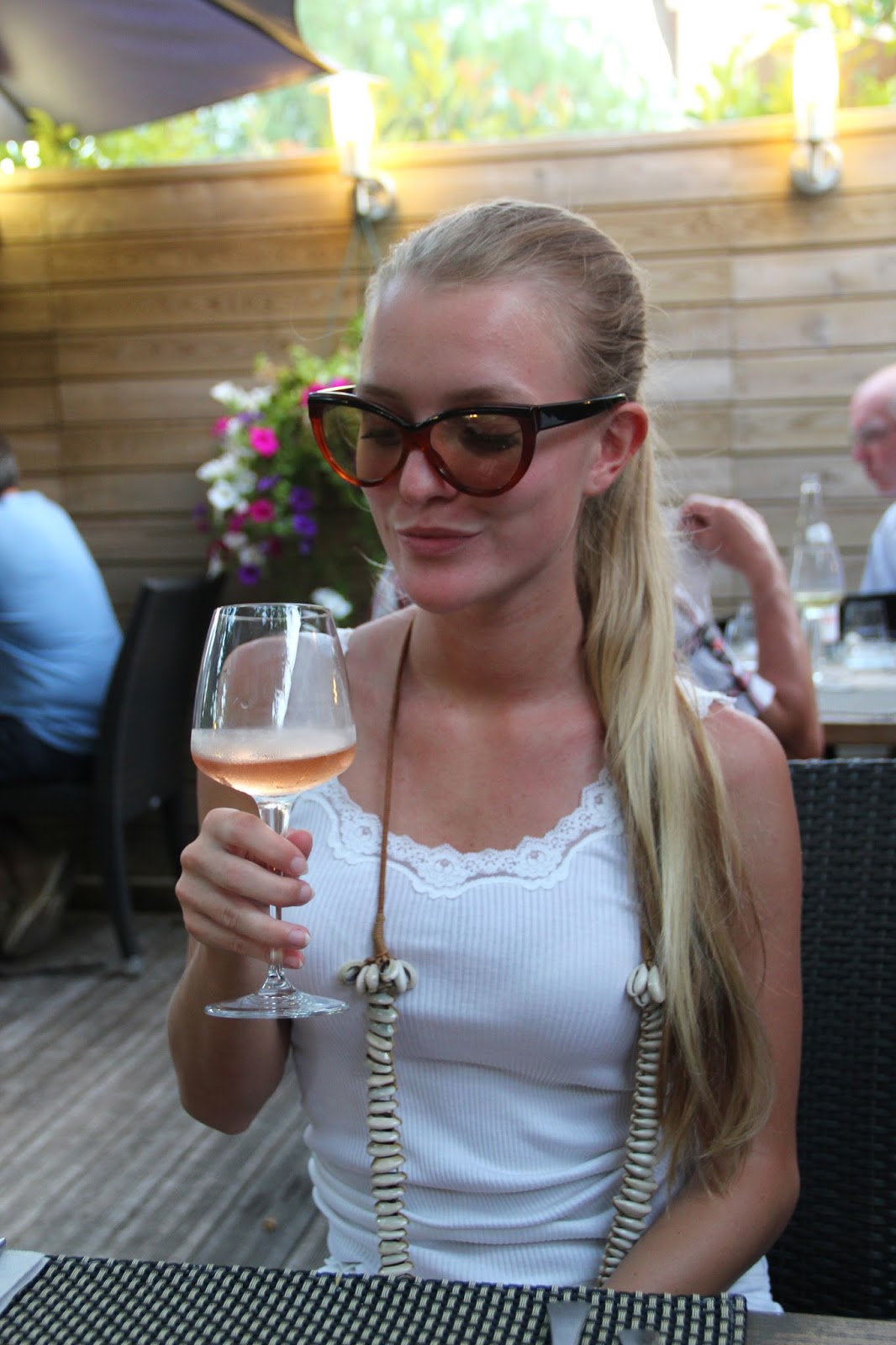 Just a little throw back to a dinner we had in Côté Jardin in Côte d’Azur. I had such delicious food! I was particularly fond of the starter: chèvre with apple and honey in a puff pastry. And my dessert was lovely too: a meringue with red berries. I had fish as a main course. I’m wearing all white (except for the accessories).