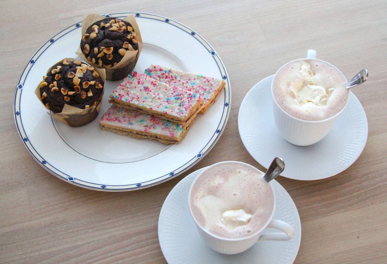 I could really eat this stuff when i get home after school today! We had this after our long walk last Sunday afternoon. It’s chocolate muffins with hazelnut topping, hot chocolate with whipped cream and a Danish cookie called “Hindbærsnitte” that tastes like raspberry. I hope you’ve all had a great start of the week.